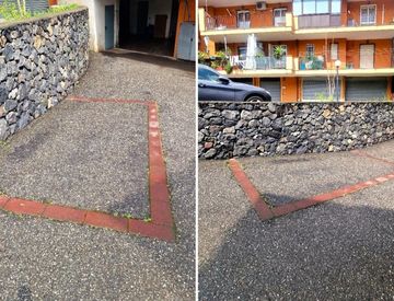 Area asfaltata, ricavata lungo muro in pietra e segnalata terra da blocchi rossi.
