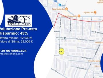 Riferimento: 4537840 VIA SALERNO 25, 81030 Teverola Caserta piena ed intera proprietà di locale box auto sito in Teverola (CE), alla Via Salerno n. 25 (già I Traversa di Via Napoli snc) all’interno del “Condominio Fertilia I” ed è identificato nel Catasto Fabbricati del Comune di Teverola (CE) al foglio 5, p. lla 5677, sub 26, cgt. C/6, cl. 2, mq 28 Data di vendita: 16/06/2026 Offerta minima: € 12.930 Valore di stima: € 23.000, 00 Studio di Fattibilità...