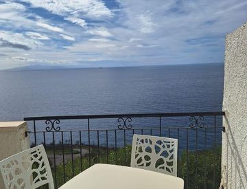 terrazzino panoramico con vista mozzafiato sul mare e sulle Isole Eolie, dove ogni sera è possibile ammirare tramonti indimenticabili, disimpegno, bagno, camera da letto matrimoniale.