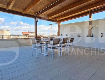 La soluzione si sviluppa su una superficie utile di circa 135 mq e si caratterizza per ambienti ampi, luminosi e ben distribuiti. L’ingresso conduce a un comodo disimpegno che introduce alla zona giorno, composta da spaziosa cucina abitabile con accesso a un ampio terrazzo, in parte coperto, ideale per momenti di relax all’aperto, accogliente salottino, vano lavanderia e servizio finestrato.