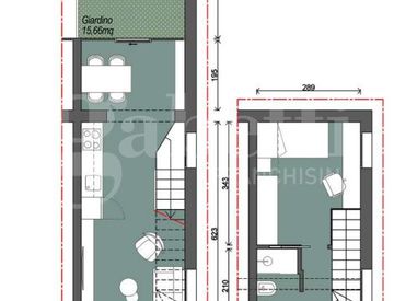 L'appartamento si sviluppa su due livelli ed è composto da ingresso sull'ampia sala con cucina a vista, con accesso al giardino e il primo bagno.