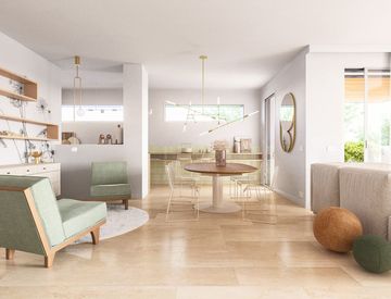 La cucina in semi-vista offre equilibrio tra funzionalità e riservatezza, mantenendo ambienti fluidi e ben organizzati.