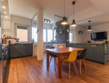 L’ingresso si apre su un luminosissimo e straordinariamente ampio soggiorno, uno spazio pensato per vivere appieno ogni momento della giornata, impreziosito da una moderna cucina a vista perfettamente integrata nell’ambiente. La zona living si estende verso una deliziosa loggia coperta, per momenti di relax, con una suggestiva vista su San Luca che regala scorci unici e un’atmosfera davvero speciale.