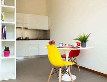 Monolocale di ampia metratura, dotato di tutti i comfort, prevede due letti singoli o un letto matrimoniale ed è provvisto di armadio, scrivania, tavolo da pranzo, TV Samsung, angolo cottura privato attrezzato con kit di stoviglie, microonde e frigo, e bagno ad uso esclusivo. Non manca la climatizzazione invernale e estiva autonoma e internet Wi-Fi.