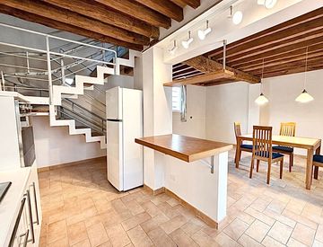 Gli spazi si sviluppano su più livelli con un articolato gioco di altezze che rende l’ambiente dinamico e suggestivo: al piano terra una zona giorno con cucina a vista accoglie in un’atmosfera calda e conviviale; al piano superiore si trova un’ampia camera da letto con bagno; il sottotetto, con zona centrale utilizzabile come studio o area relax, offre uno spazio intimo e raccolto.