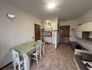Soggiorno con angolo cottura, disimpegno, camera matrimoniale e bagno.