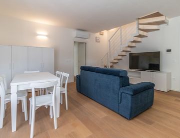 L'appartamento è dotato di riscaldamento a pavimento e impianto di climatizzazione con pompa di calore, garantendo un comfort ottimale in ogni stagione. La domotica e le frangisole elettriche aggiungono un tocco moderno e funzionale.