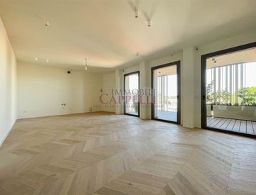Entrando troviamo l`ampio e luminoso soggiorno open space di 43 mq con cucina a vista, accesso al terrazzo di 19 mq ottimo per momenti di relax e convivialità, bagno. Dal comodo disimpegno si accede al zona notte che é composta da due camere da letto con ulteriore balcone di 15 mq e bagno finestrato.