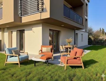 L’appartamento di 108 mq posto al piano terra ha un’ingresso indipendente e si compone di soggiorno con cucina a vista, disimpegno notte con angolo lavanderia, due camere matrimoniali, una camera singola, doppi servizi, cantina, garage e giardino privato di 166,5 mq oltre a 41 mq di area pavimentata. La zona giorno e le camere hanno accesso diretto all’area esterna.