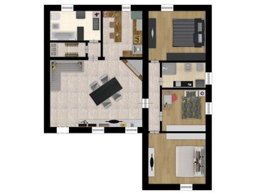 Qui, al primo e ultimo piano, si apre un appartamento di 150 mq che conquista al primo sguardo: un salone ampio con camino, dove il fuoco diventa compagno di serate lente e preziose, una cucina abitabile che profuma di convivialità, tre camere spaziose, due bagni e comodi ripostigli.