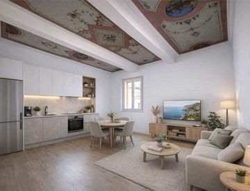 - ampio ingresso di 13mq, soggiorno con cucina a vista con affresco originale al soffitto, 2 camere da letto, bagno, cantina di 14mq e locale deposito per e-bike.