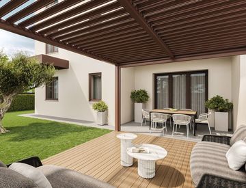 APP. TO 02 - al PIANO TERRA, ZONA GIORNO di 30mq, TERRAZZO di 7mq, GIARDINO privato di 130mq, 3 CAMERE da letto e 2 BAGNI.