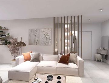 Zona giorno open-space con ingresso - soggiorno - cucina e balcone, tre camere letto (1 matrimoniale con bagno in suite, 1 matrimoniale/doppia e 1 singola) secondo bagno.