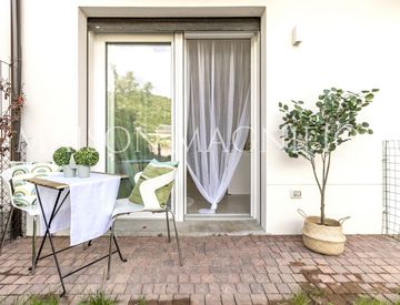 L'ingresso si apre su una zona giorno luminosa, con angolo cottura e ampie vetrate che si affacciano su un delizioso giardinetto privato: uno spazio verde dove potrai goderti la colazione all'aperto, leggere un libro al sole o rilassarti dopo una giornata intensa.
