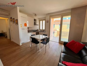 L'appartamento, sito al piano primo servito da ascensore, si apre su un'accogliente zona living con cucina a vista (già arredata), che si affaccia sul terrazzo. La zona notte comprende una spaziosa camera matrimoniale, un disimpegno funzionale con ripostiglio e un bagno curato nei minimi dettagli.
