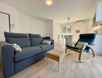 L’ingresso in casa avviene su un pratico disimpegno, dotato di un angolo per lavatrice/asciugatrice, che conduce al luminoso soggiorno, dotato di angolo cottura e portafinestra da cui si accede con comodità a proprio riservato balcone di 10 mq e alla loggia di 5 mq.