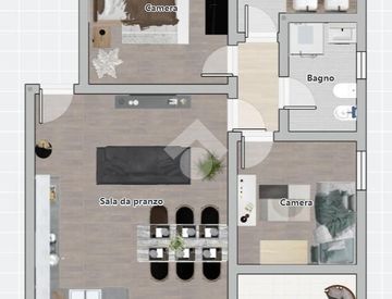 L'ingresso si apre su un luminoso soggiorno con angolo cottura, ideale per chi ama gli spazi aperti e conviviali. La zona notte comprende due camere da letto, una matrimoniale e una singola, perfette per una famiglia o per chi desidera uno spazio aggiuntivo per ospiti o studio.