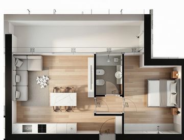 Il bilocale si compone di luminosa zona giorno con cucina a vista, comoda terrazza abitabile, camera da letto e un bagno. Dotato di serramenti in alluminio di alta qualità, raffreddamento e riscaldamento a pompa di calore, cappotto termico di ultima generazione, finiture eleganti e materiale di pregio.