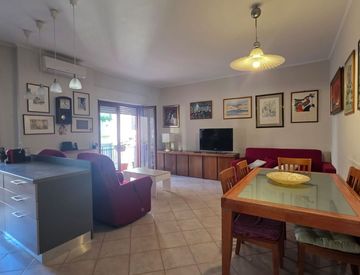 L'appartamento è in buono stato di conservazione, con infissi nuovi e aria condizionata per garantire il massimo comfort in tutte le stagioni. Gli armadi a muro ottimizzano lo spazio, mentre i due balconi, uno dei quali più ampio con tavolino da caffè e sedie, offrono un angolo perfetto per rilassarsi all'aperto.