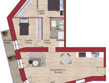 - Appartamento n°1 – 3° piano – mt. 73 con 2 balconi di mt 7,00 nel soggiorno e mt. 2,5 in una delle camere da letto (trilocale) -