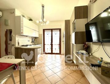L'ingresso si apre su una cucina abitabile, caratterizzata da un'abbondante illuminazione naturale garantita da ampie porte finestre con affaccio su un ampio terrazzo vivibile.