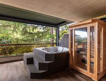 – Salone triplo con ampie vetrate e uscita diretta sulla terrazza privata, dove si trovano una jacuzzi e una sauna panoramica