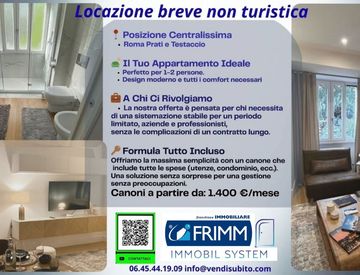 Posizione centralissima Roma Piazzale Clodio Il tuo appartamento ideale - Perfetto per 1-2 persone - Design moderno e tutti i comfort necessari A Chi Ci Rivolgiamo - La nostra offerta è pensata per chi necessita di una sistemazione stabile per un periodo limitato da 3 a 6 mesi, aziende e professionisti, senza le complicazioni di un contratto lungo. Formula Tutto Incluso Offriamo la massima semplicita' con un canone che include tutte le spese (utenze,...