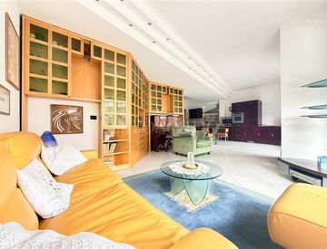 La zona giorno è composta da un ampio ingresso con finestra, un disimpegno con funzionale armadiatura a muro e un ampio salone doppio, il cui arredo è stato realizzato su misura, una grande cucina a vista dotata di piano di lavoro in pregiato marmo e tavolo di design con basamento in vetro-cemento; dalla zona giorno si accede ad un ampio balcone dotato di tende da sole e affaccio aperto.