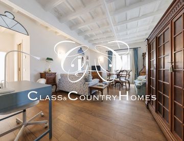 L'immobile unisce il carattere d'epoca a una razionale distribuzione degli spazi interni, impreziositi da caratteristici soffitti a cassettoni. Viene locato completo degli arredi visibili in foto, scelti secondo un gusto classico e leggero.