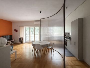 La composizione è la seguente: ingresso, ampio soggiorno con zona pranzo e accesso diretto alla balconata vivibile, cucina a vista sapientemente schermata da una quinta architettonica curva che ne definisce gli spazi, due camere da letto di dimensioni generose, antibagno e bagno finestrato, dotato sia di vasca che di doccia.