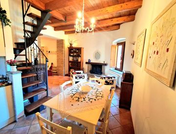 Al secondo piano troviamo un ampio e luminoso salone con angolo cottura, ideale per momenti di convivialità, oltre a un comodo bagno di servizio.