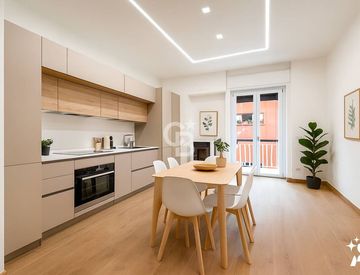 L’ingresso conduce in un luminoso soggiorno con angolo cottura e accesso al balcone, perfetto per chi ama vivere la casa in modo conviviale. La zona notte comprende due ampie camere da letto con grandi finestre e un bagno moderno finestrato.