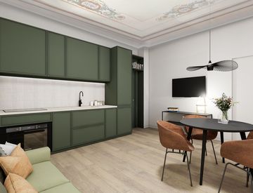 All’ingresso si viene accolti da un’ampia zona giorno open space, con cucina su misura dalle linee essenziali e una luminosa area living che si affaccia sull’esterno, perfetta per momenti di relax o convivialità. I soffitti alti decorati con affreschi originali donano un carattere unico e un fascino senza tempo a ogni ambiente.