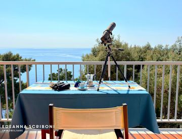 Varcata la soglia, un disimpegno introduce agli ambienti principali. Il soggiorno accoglie in un ambiente luminoso e ben distribuito la cucina, la zona pranzo e l’area living. Da qui si accede al terrazzo panoramico, completamente fronte mare e molto soleggiato: uno spazio che diventa naturale prolungamento della zona giorno, ideale per ospitare un tavolo da pranzo o sedute relax da cui godere del panorama in ogni momento della giornata.