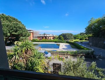 La loggia, accessibile dalla sala e dalla cucina, regala una vista mozzafiato sul mare e sulla piscina, rendendo ogni giorno speciale. Con due bagni e una grande dispensa, questo appartamento soddisfa ogni esigenza. Gli interni sono in buono stato e il riscaldamento centralizzato garantisce un ambiente accogliente in ogni stagione.