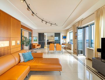La zona notte, ben separata, ospita tre camere di cui una sontuosa suite padronale con cabina offrendo continuità tra interno ed esterno e consentendo di godere della vista mare da ogni ambiente: un vero lusso urbano, raro da trovare.