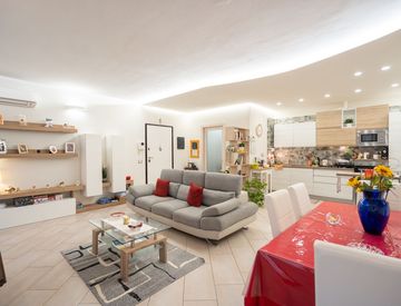L'appartamento si apre su un ampio e luminoso soggiorno con cucina a vista, dotato di accesso diretto a un comodo terrazzo, perfetto per momenti di relax all’aperto.