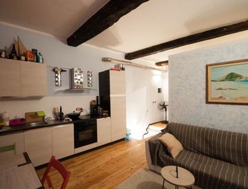 A solio 50 mt. dalla piazza principale e dal mare. In palazzina del centro storico al piano secondo, bilocale al secondo piano, completamente ristrutturato, con travi a vista e così suddiviso: soggiorno con cucina a vista, camera matrimoniale, bagno con doccia e piccolo ripostiglio. Completamente arredato.
