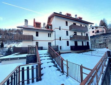 La porta d'ingresso dell'alloggio conduce direttamente nella zona giorno che è costituita da un soggiorno arredato con tavolo da pranzo e divano letto e dall'angolo cottura a vista separato solo da una struttura forata in legno. La zona giorno è dotata di porta finestra con accesso al balcone di proprietà, dal quale si gode di vista sulle vette delle montagne.