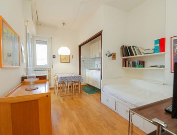 L'appartamento, che è al quarto ed ULTIMO PIANO (con ascensore), è composto da ingresso, soggiorno con angolo cottura, camera, bagno e 2 balconi.