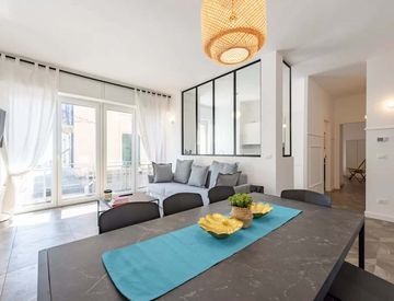 Incantevole appartamento di 105m² a Rapallo con due balconi, di cui uno con vista sulla spiaggia. Dispone di tre camere da letto (una matrimoniale con Smart TV, una queen size e una con letto estraibile), due bagni (uno en suite), un soggiorno con Smart TV e divano letto, e una cucina completamente attrezzata. La zona pranzo può ospitare fino a otto persone ed è disponibile uno spazio scrivania.