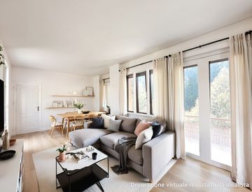 Il trilocale offre una grande e luminosa zona giorno composta da soggiorno e cucina con finestre e porte finestre con uscita su una balconata che affaccia sul verde.