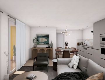 L’immobile è così composto: ingresso, ampio soggiorno con angolo cottura e accesso al terrazzo di circa 14 mq, due camere da letto e doppi servizi, di cui uno con uscita sul balcone.