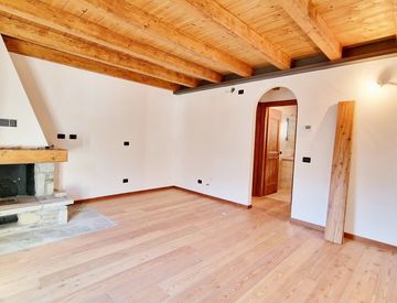 Finiture di alto livello, in stile montano, travi interne in legno a vista, camino termo-ventilato a legna, Doppio balcone esposizione Sud e Nord con vista sulle piste da sci! bagno finestrato con mobiletto in muratura, autonomo con caldaietta a gas metano, pavimento in legno