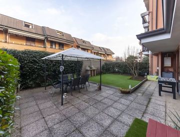 L'appartamento offre l'ingresso su un luminoso soggiorno con accesso al patio esterno perfetto per momenti di relax all'aperto, cucina abitabile che si affaccia su un bellissimo giardino privato, spazio ideale per pranzi e cene.