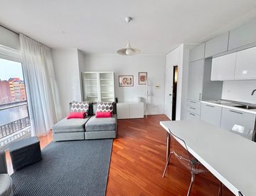 Gradevole bilocale la cui caratteristica è la particolare luminosità' - 63 mq L'appartamento è situato al quinto piano Living ben arredato con pavimentazione in parquet massello ed angolo cottura accessoriato con ottimi elettrodomestici Infissi nuovi a taglio termico con triplo vetro - climatizzato Camera matrimoniale corredata di armadiature capienti e bagno dedicato Completa questa proprietà la cantina di pertinenza Euro 1.150/mese + spese.