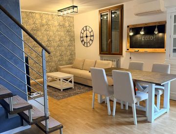 La mansarda, collegata da una elegante scala in legno, ospita una camere da letto, una zona living e un bagno con vasca, offrendo spazio e privacy. Gli interni sono stati completamente ristrutturati con finiture di alta qualità, come il parquet in tutta la casa e i bagni moderni. Dotato di riscaldamento autonomo, porta blindata, videocitofono, aria condizionata e zanzariere, questo appartamento è pronto per essere abitato.