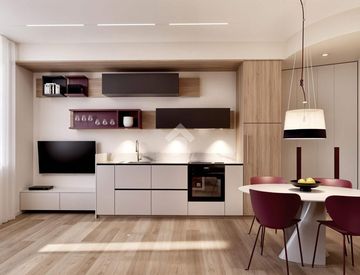 L'ingresso, caratterizzato da eleganti abbassamenti estetici con luci a led, apre su uno spazioso living con angolo cottura, estremamente luminoso grazie alla grande vetrata che garantisce un'eccellente luminosità naturale.