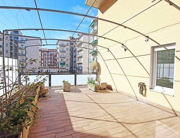 Ampio ed elegante appartamento penta locale di mq 180 dotato di 100 mq di splendida terrazza, cantina e posti auto condominiali liberi.