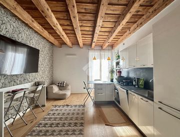 La ristrutturazione ha saputo valorizzare il connubio tra moderno e storico: da un lato finiture contemporanee come illuminazione a LED e radiatori di design, dall'altro elementi originali di pregio come le travi a vista, perfettamente integrate nell'ambiente.